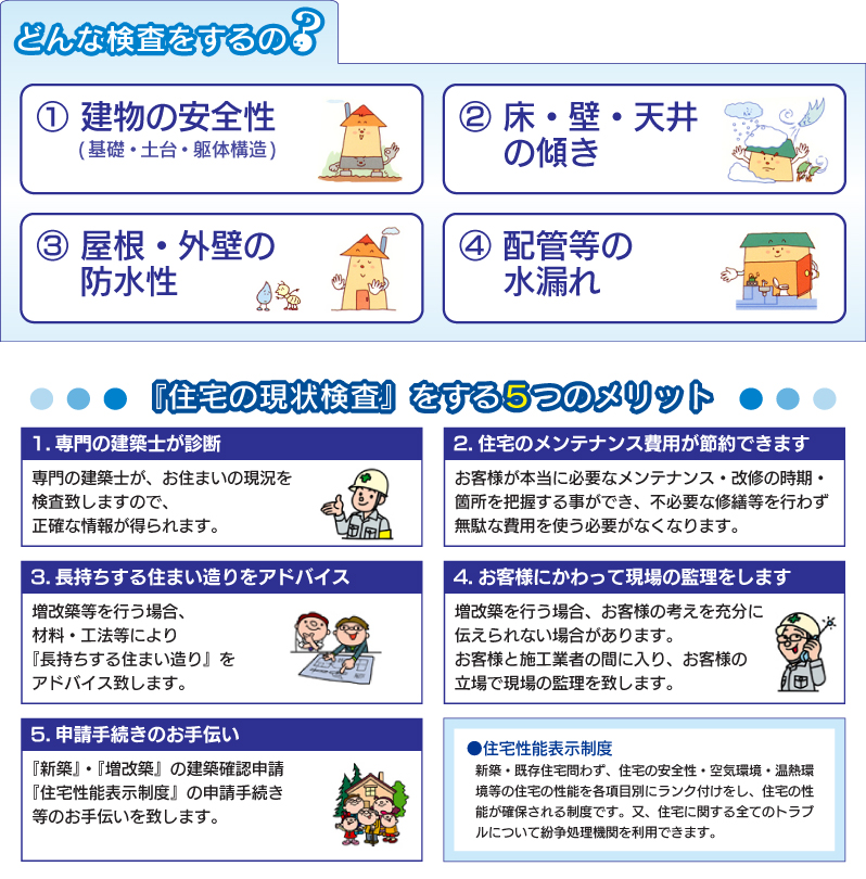 住宅の検査をします。ここ数年、新築だけでなく増改築・リフォーム時のトラブルが多発し、欠陥住宅問題がさまざまな形で取りざたされています。