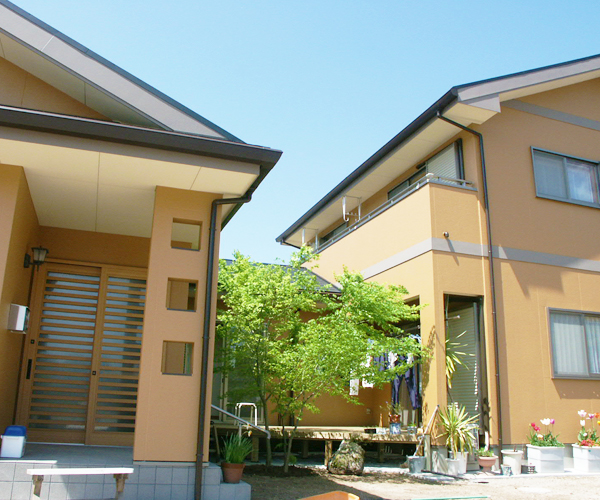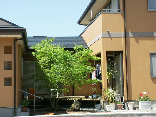 高齢になったご両親との同居を考え、二世帯住宅を建てたいとのご意向でした。 南北に細長い敷地を生かし、水廻りを共有してコの字型の配置に。日当たり、風通しもバツグンです。 |
